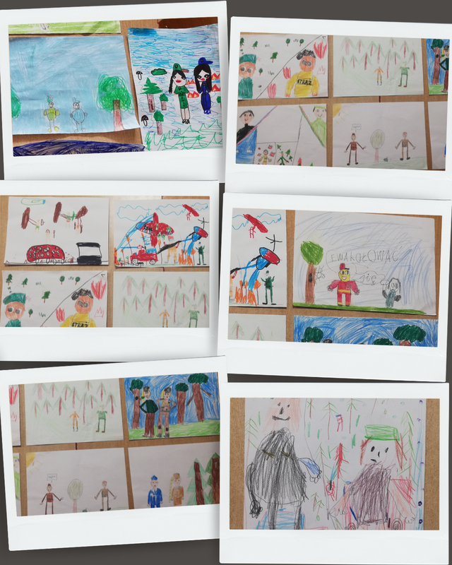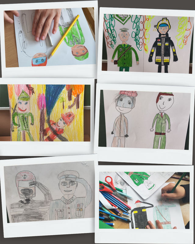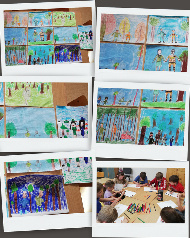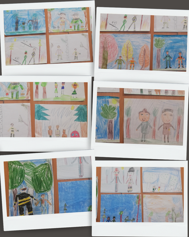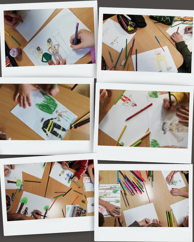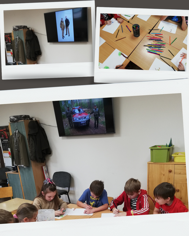 Za mundurem… dzieci sznurem! Coś takiego jest w mundurze, lesie, ogniu, że dzieci słuchają, pytają, opowiadają i pracują, tworząc zawzięcie wizerunki umundurowanych leśników i strażaków. Pierwsze w tym roku świetlicowe opowieści o pracy w lesie dotyczyły ubioru leśnika, współpracy leśników ze strażakami oraz „codziennostek” leśnej pracy. Oczywiście każdy Świetliczak drugoklasista wie - przy zgaszonym świetle w sali również - że szkolne leśne opowieści snują się w brzozowym lesie (choć to tylko świetlicowa ścienna tapeta).